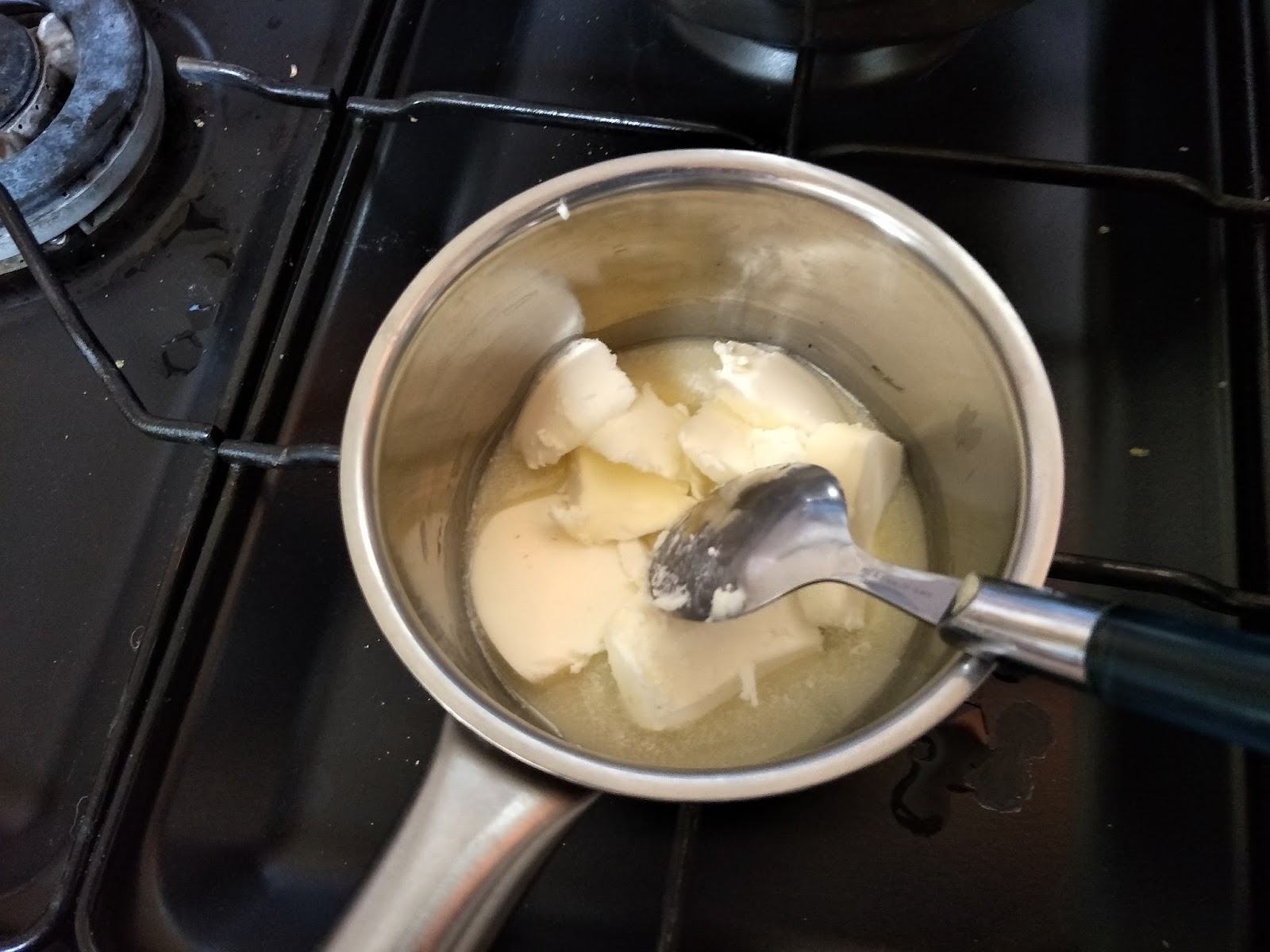 Sciogliete a fuoco basso il burro in un pentolino, quindi versatelo nei biscotti e amalgamate per bene.